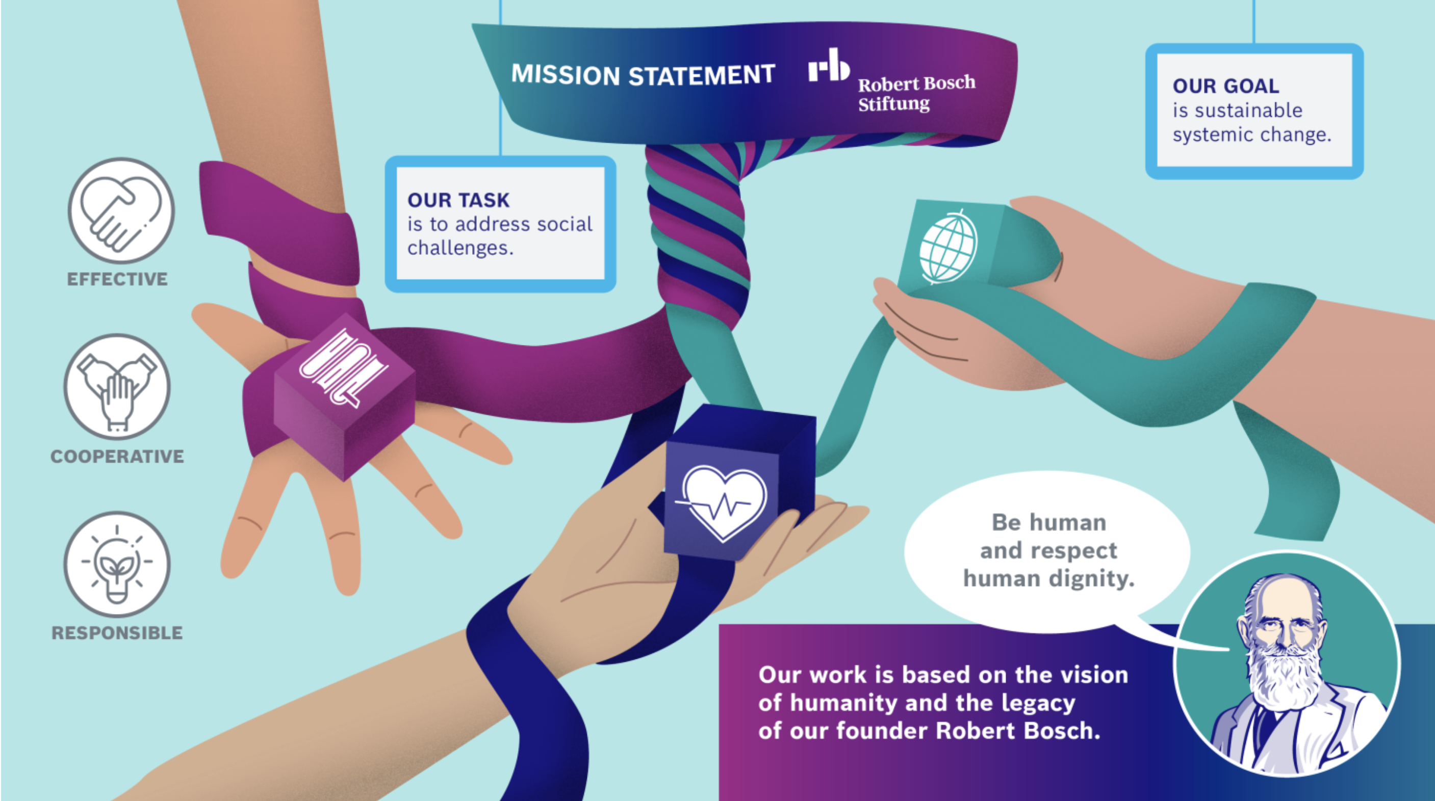 I have been asked to provide an illustrative portrait of the founder Robert Bosch, to appear in appropriate stature, but with a friendly touch.